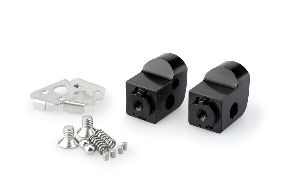 Die Vintage Fußrasten von Puig sind so konzipiert, dass sie sich natürlich an Motorräder im Retro-Stil anpassen, sowohl für die original-Serie als auch für die meisten persönlichen Vorbereitungen. Diese Fußstützen werden ausgehend von einem Aluminiumblock hergestellt, auf dem eine eloxierte Oberfläche hergestellt wird, auf der wiederum eine Gummiauflage montiert ist, um die Griffigkeit des Schuhs und die Isolation von Vibrationen zu verbessern. Trotz seiner klassischen Formen wurde die Ergonomie bei der Gestaltung berücksichtigt, wobei das geneigte äußere Ende die Bodenfreiheit erhöht. Seine Abmessungen von 72 mm x 27 mm ermöglichen eine korrekte Abstützung des Fußes und im Körper wurden einige Markierungen aufgezeichnet, um die Präzision bei der Montage zu gewährleisten, wodurch die Neigung reguliert werden kann. Die Vintage-Fußrasten sind in Schwarz und Silber erhältlich, wiegen 90 Gramm und sind ABE-zertifiziert und TÜV-zertifiziert.