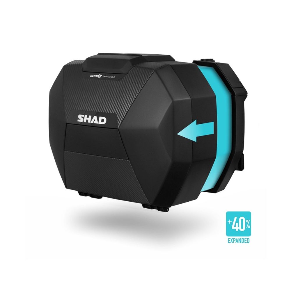 Der SH38X lässt sich um 70 mm erweitern, was sein Volumen um 40 % vergrößert und die Unterbringung eines modularen Helms im XL-Format (ECE 22-06) ermöglicht. Dies macht den SH38X zum kompaktesten erweiterbaren Helmseitenkoffer auf dem Markt.